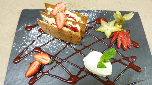 C'est un 1000 feuilles de crêpes séchées au four avec une crème légère à l'amande servis avec une soupe de fraises et menthe ainsi qu'une glace au lait ribot.