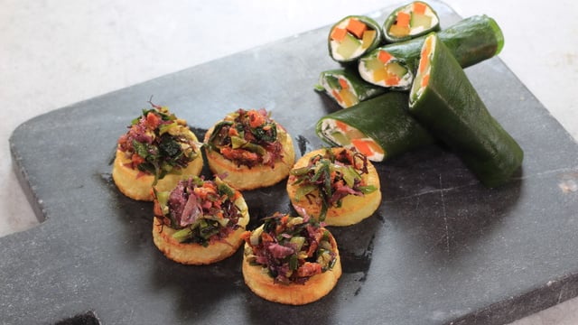 Roulés aux algues, crudités et fromage de chèvre frais