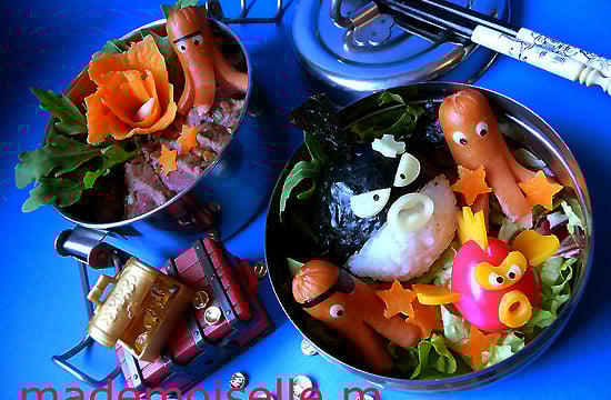 Dresser les saucisses, les oeufs et la boule de riz dans votre bento en décorant de jeunes pousses de roquettes et d'étoiles de gouda, de fleurs de tomates cerises et de rondelles de concombre. Bon appétit !