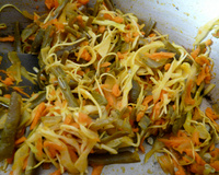 - 1Utiliser une mandoline pour couper tous les légumes séparément en petits rectangles d'1 cm mais trés plats pas plus d'1/2cm épaisseur. Le chou vert sera rapé fin.