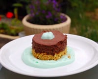 Biscuit façon cheese cake sous une mousse au chocolat, le tout délicatement déposé sur un espuma à la menthe