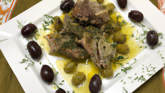 Une épaule d'agneau cuite au four sur un lit de fenouils fondants parsemmés d'olives vertes et noires