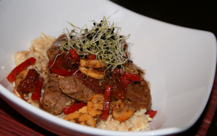 Un délice diététique sur un lit de céréales, un wok d'agneau juste poêlé, des champignons, du poivron, quelques tomates séchées, relevé à la sauce soja et vinaigre de riz et adouci au mirin. Quelques jets d'ail sur le dessus pour le piquant cru et croquant.