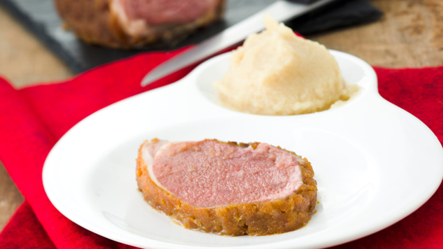 Servir l'agneau en croûte de pain d'épices accompagné d'une purée de céleri adoucie de crème.