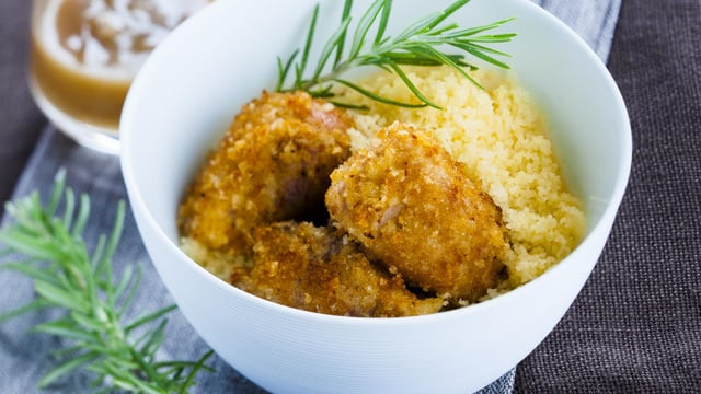 Servir les cubes d'agneau panés, accompagnés de la sauce au beurre et d'une semoule. Décorer d'une branche de romarin.