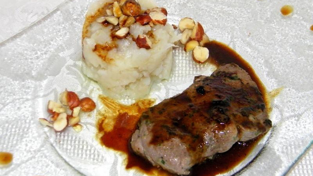 Faire mariner 2 h à l'avance les steaks d'agneau dans un mélange d'huile, de 4 épices et d'herbes et de poivre vert moulu.
