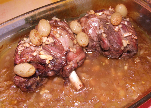 - 1PréparationConcassez les amandes dans un mortier et les mélanger aux épices. Epluchez et émincez l'oignon et l'ail. Ajoutez-les également au mélange épices-amandes. Frottez les deux talons de gigot d'agneau avec le mélange. Placez l'agneau dans un plat allant au four préalablement huilé. Versez le bouillon de volaille, le vin blanc et le mélange sur le dessus et tout autour de la viande. Placez sur l'agneau quelques raisins blancs. Préchauffez le four.