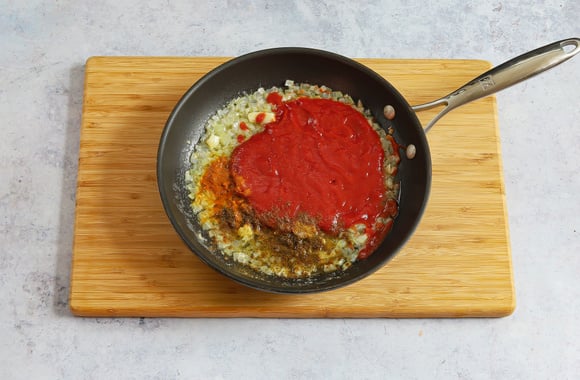 4Ajoutez les gousses d'ail hachées, le coulis de tomate et le reste d'épices. Laissez mijoter 5 minutes.