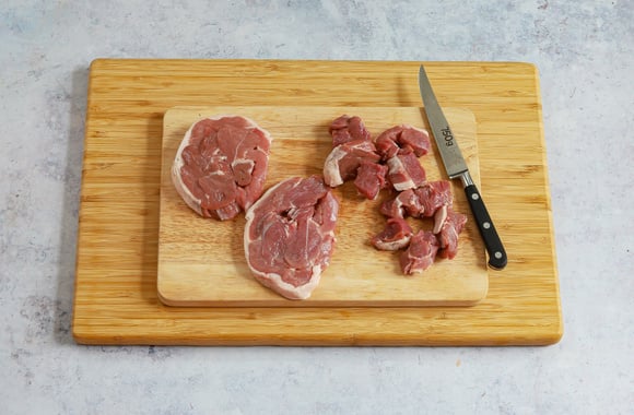 1Coupez les tranches de selles d'agneau en cubes et disposez-les dans un plat à gratin.