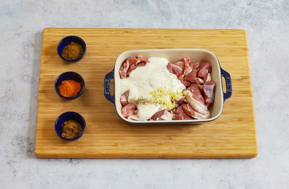 2Ajoutez 100 g de yaourt nature, 1 cuillère à café de curcuma, 1 cuillère à café de cumin, 1 cuillère à café de garam masala, le sel et le gingembre râpé. Mélangez et laissez mariner au frais pendant 1 heure.