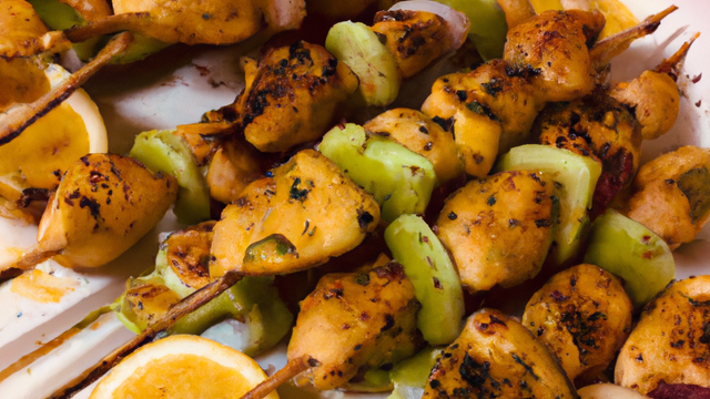 Monter les 6 brochettes aux agrumes en alternant 1/4 de citron, cube de poulet et 1/4 d'orange (ainsi de suite), puis les 6 brochettes au curry en alternant cube de poivron et poulet. - 4