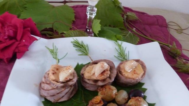 Dans chaque assiette,disposez joliment trois aiguillettes au foie gras parfumées à la purée d 'ail , sur une feuille de vigne. Garnissez avec les gousses d 'ail réservées. Repartissez les trois sortes de raisins .Nappez de sauce au Floc et dégustez sans tarder!