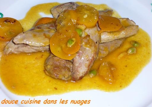 Ajouter dans la sauteuse le reste de graisse de canard, faire revenir l'échalote et le gingembre 2 min sans coloration, ajouter les tranches de kumquats cuire 2 mn puis ajouter le jus des oranges, le miel et le fond de veau .Saler.