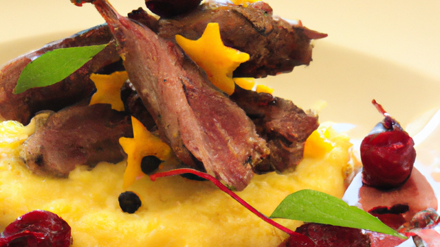 Dresser les frites dans vos assiettes, disposer les aiguillettes par dessus et arroser avec la sauce à la cerise.