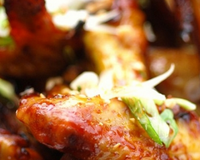 Dès que c'est prêt placez sur une assiette et versez un peu de sauce sur les ailes, finissez en jetant dessus les oignons nouveaux et les cacahuètes.