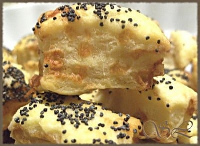 Farinez légèrement le plan de travail et étalez la pâte au rouleau à pâtisserie en formant un rectangle. Saupoudrez de graines de pavot. Taillez les allumettes à l'aide d'une roulette à pâtisserie.