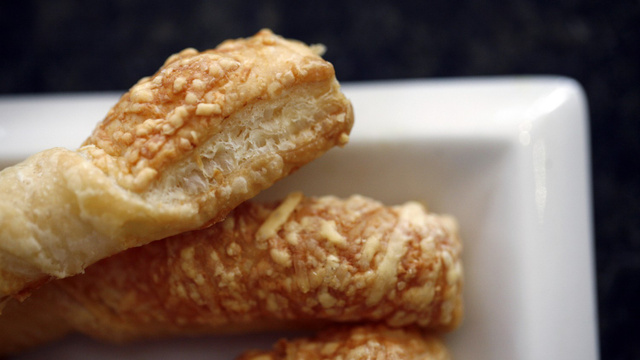 Mélanger l'oeuf et le sel puis badigeonner la pâte feuilletée. Ajouter le fromage râpé et le paprika.