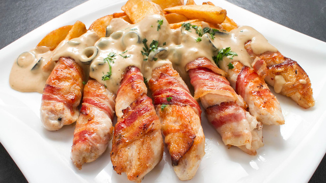 Enroulez chaque allumette de poulet avec le lard fumé et fixez à chaque bout avec des cure-dent ou de la ficelle de cuisine.