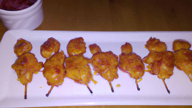 allumettes de poulet au sirop d'érable et oignons confits, accompagnées d'une compote pomme-aubergine