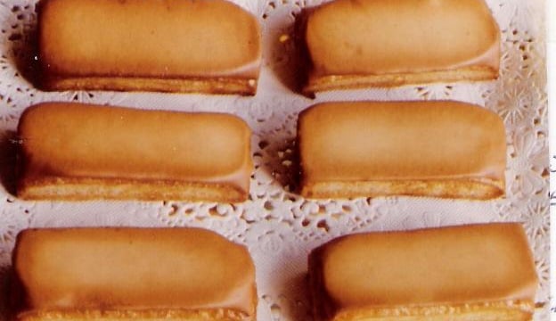 Etaler une bande de feuilletage de 15 cm de large sur 1/2 cm d'épaisseur longueur indifférente. Etaler sur la surface une mince couche régulière de glace royale. Découper avec un couteau dont la lame est passée sur un linge humide des pièces de 5 cm de largeur - les poser sur plaque - laisser sécher 15 minutes à l'air libre. - 3