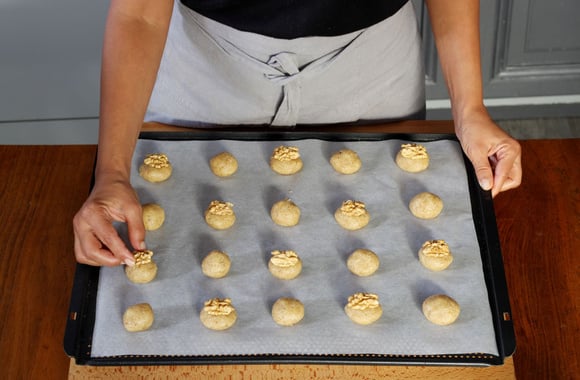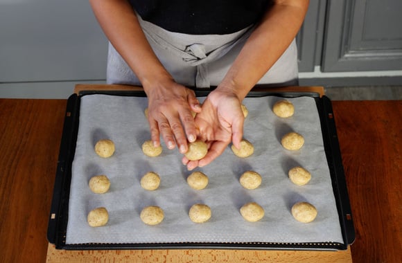 6Avec la pâte obtenue, faites des boulettes de la taille d'une noix et disposez-les sur une plaque recouverte de papier sulfurisé.