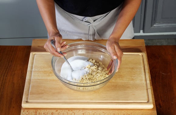 3Mettez la poudre de noix dans un saladier, ajoutez le sucre puis mélangez.