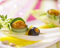 Farcir les olives noires avec le délice de poivrons jaunes et mettre sur chaque feuille d'endive : une olive farcie et une rondelle de courgette.