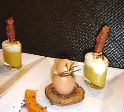 Cuire 4 minutes au miro-ondes les lamelles de potimarron dans un plastique, comme la 1ère moitié. Dresser l'assiette en prélevant un petit rond à l'emporte-pièce sur chaque galette et en posant l'oeuf dessus. Verser un peu de gaspacho dans chaque oeuf, poser le couvercle et décorer avec une branchette de romarin.