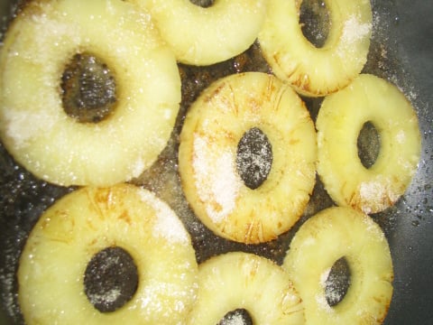 - 1Dans une poêle chaude faire fondre le beurre puis ajouter les rondelles d'ananas.