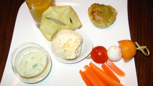 Une façon légère de prendre l'apéritif, en profitant des herbes du jardin : glace, tuiles, cakes aux herbes, crème de carotte glacée...