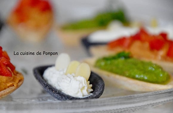 2Blanc : Dans un bol, mélanger le fromage aux fines herbes et le mascarpone. Placer le mélange dans une poche à douille et douiller sur les fines coquilles. Garnir de quelques amandes effilées