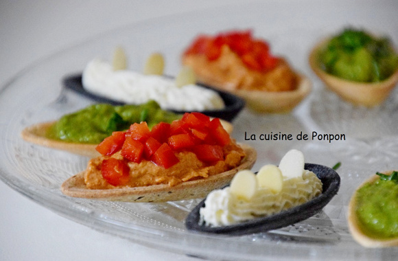 3Rouge: Dans un bol, mélanger la crème de tomates séchées avec le mascarpone. Garnir les fines coquilles à l'aide d'1cc. Parsemer de petits dés de poivron doux. Laisser au frigo jusqu'au moment de servir.