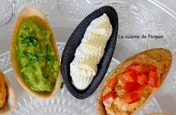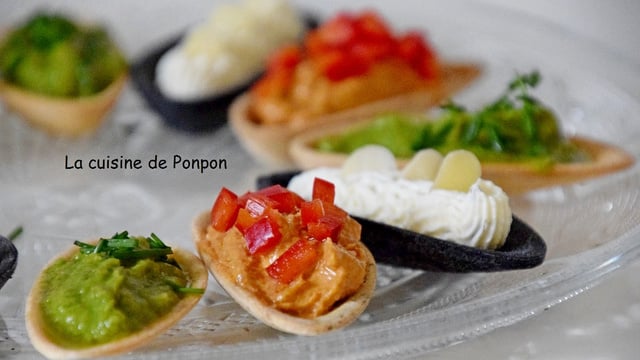 1Vert : Dans un bol, mixer l'avocat épluché et coupé en morceaux avec un peu d'huile et de sel. Garnir les fines coquilles à l'aide d'1 c à c. Disposer un peu de ciboulette ciselée.