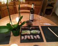 Disposer sur l'ardoise du centre les recettes de la façon suivante : à gauche, aligner les tranches de Daurade dans la longueur ; aligner ensuite les 2 rouleaux de printemps et enfin disposer 2 brochettes (en les alignant également). Garder 2 brochettes au chaud dans la poêle en ajoutant un couvercle afin de pouvoir resservir le ou les gourmands.