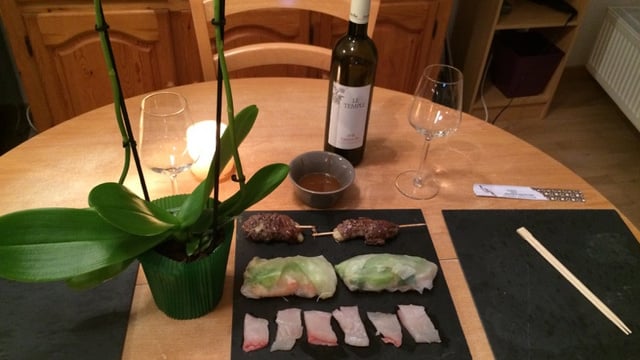 Un voyage culinaire asiatique avec 3 classiques : les rouleaux de printemps, les sashimis de Daurade et les brochettes yakitori.