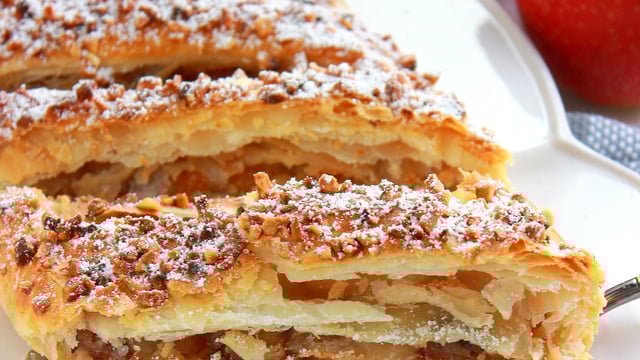 C'est un délicieux gâteau fait avec une pâte feuilletée fine. Iil en existe différentes variantes à base de pâte filo ou bien encore de pâte brisée. Il est fourré d'une garniture à base de pommes, de raisins, d'amandes et de cannelle. Une gâteau très facile à réalisé et tellement bon, qu'il serait vraiment dommage de s'en privé !