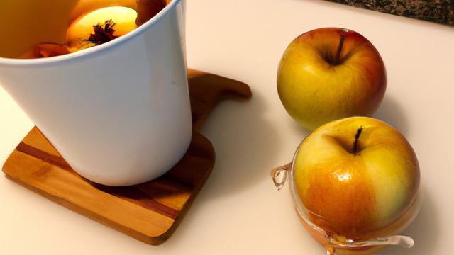 Je fais chauffer le thé, le jus de pommes , le miel et la cannelle dans une casserole. Je sers dans une chope au verre épais.