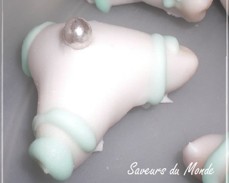 Colorer le reste du glaçage. Avec une poche à douille faites le décor et placez une perle sur le dessus.Laissez séchez le glaçage toute la nuit.