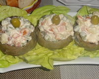 Une fois les légumes refroidis, ajouter la mayonnaise à la macédoine et remplissez les fonds d'artichauts, décorer avec une olive.