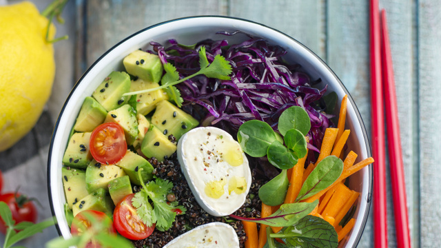 Préparer une sauce avec de l’huile de tournesol, du jus de citron, de la sauce soja sucrée et présentez la pour accompagner ce bol vitaminé.