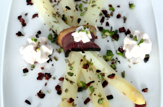 Montage et présentation : Superposez sur une assiette plate 3 asperges, enroulez une tranche de magret au centre des 3 puis déposez les ronds de magret sous chaque tête , A l'aide du siphon, ajoutez des rosaces de chantilly, saupoudrez l'assiette des dés de magrets et d'asperge pourpre rapée et servez aussitôt.