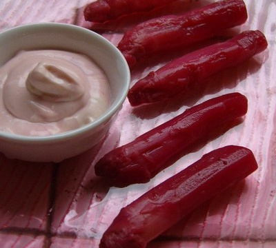 Des asperges teintées en rose accompagnées d'une sauce...rose...