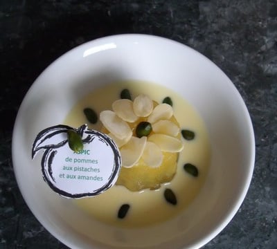- 4Disposer les pommes soit dans un grand moule à savarin ou à charlotte, soit dans des ramequins individuels.Intercaler les pistaches et les amandes entre les quartiers.Lorsque le moule est rempli, bien tasser et garder au réfrigirateur au moins 12 heures (une nuit).