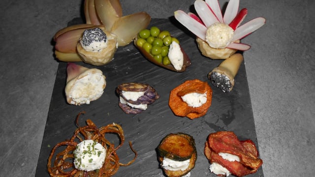 Farcir avec le fromage le centre des artichauts et le cône et recouvrir de sésame et graines de pavot. faire quelques boule avec le fromage et mettre les radis et feuilles d'artichaut en éventail derrière chaque coeur.