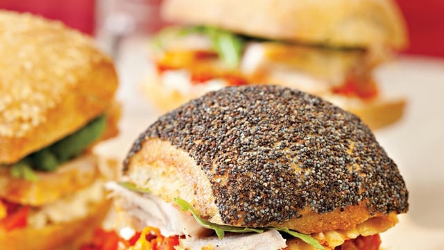 Dans les pains au pavot disposer une couche de tomates confites, une couche de tranche de dinde, quelques feuilles de salade roquette et refermer.