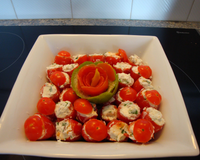 Garnissez les tomates de ces différents mélanges. Ajoutez des œufs de lompe et des œufs de truite sur les tomates garnies de fromage frais au citron. Replacez les chapeaux et servez en apéritif.