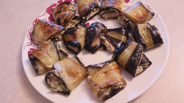 Tartiner chaque tranche d'aubergine, et plier en trois comme une lettre.