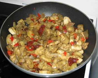 Ajoutez les tomates séchées coupées en tranche, et laissez cuire encore 5 min environ ou plus : les aubergines doivent être fondantes mais pas trop cuites.