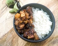 Dans une autre poêle, faite revenir le vinaigre balsamique avec le sucre et un peu d’ail en poudre. Une fois que le caramel commence à se former, rajoutez la sauce soja, et 5 gr de maizena délayée dans 5 cl d’eau.