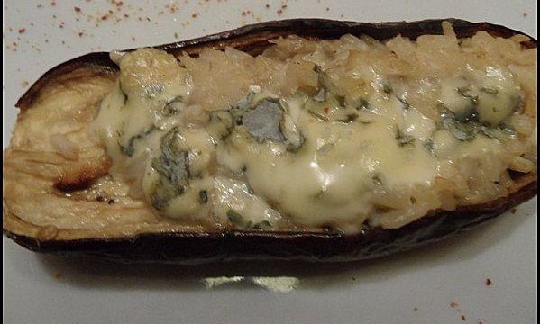 Préparation des aubergines : Remplir les aubergines avec le risotto de cabillaud, disposer dessus la Fourme d' Ambert.et les placer dans un plat recouvert de papier aluminium avec un peu d'huile d'olive et un peu d'eau, enfourner à 180°C et laisser cuire jusqu'à ce que la chair soit tendre, vérifier avec un couteau.